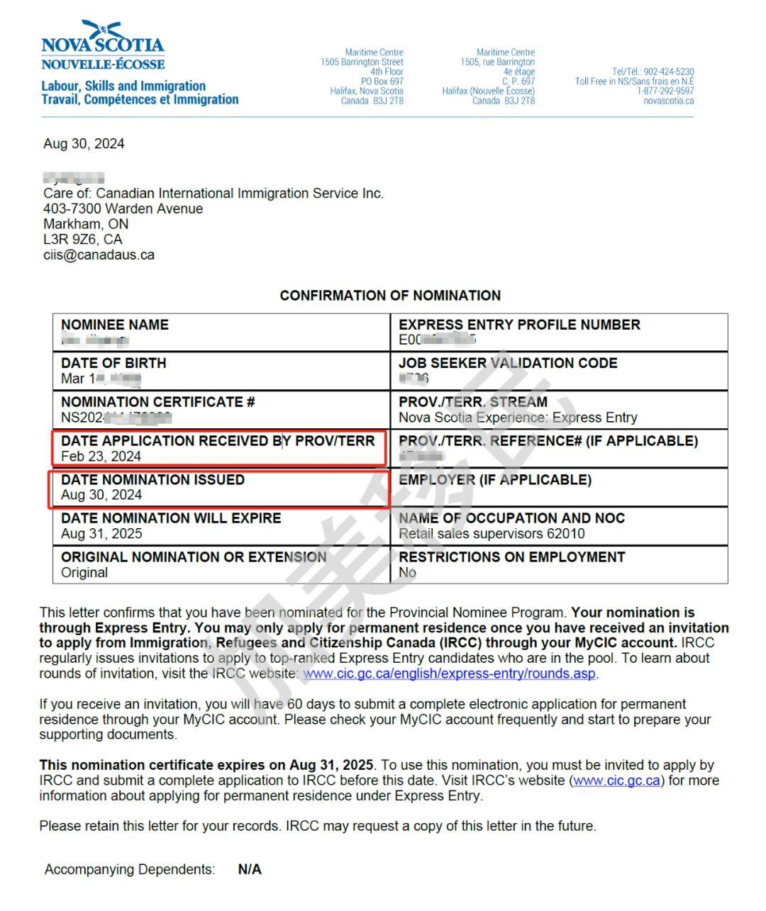 我们刚获批的NS的EE申请人,今年2月23日提交NS省提名申请,8月30日获批,6个月的审理时间。