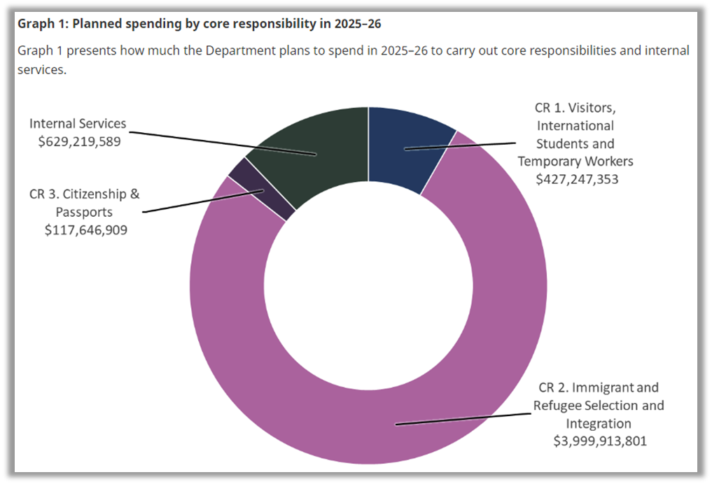 根据IRCC同期发布的年度报告,2025–26财政年度的总支出预计将达 51.7亿加元,用于支持移民、留学、公民事务及内部管理。以下为重点支出方向: