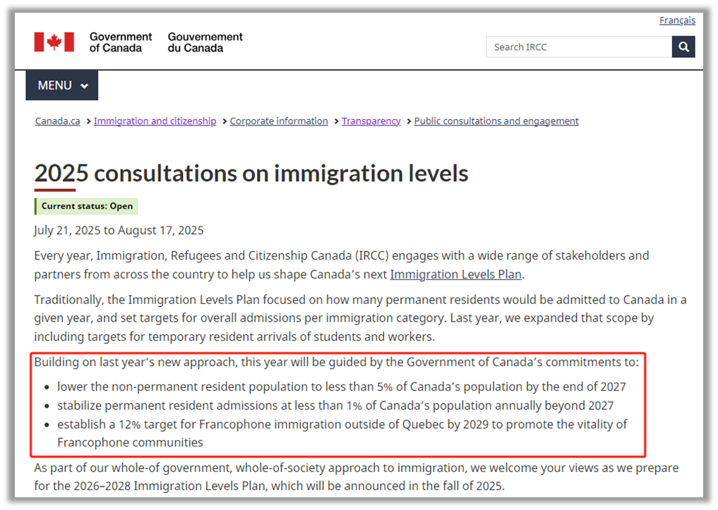 加拿大移民、难民及公民部(IRCC)于2025年7月21日正式启动新一轮全国范围的移民配额公众咨询。此次咨询将持续至2025年8月17日,旨在广泛听取来自全国各界利益相关者的意见,以筹划2026至2028年《移民配额计划》。最终计划预计将在2025年秋季对外发布。