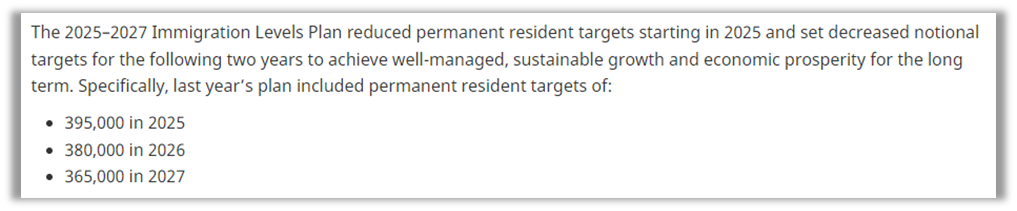 根据2025–2027年《移民配额计划》,加拿大将逐年减少永久居民配额,以实现更可持续的发展路径: