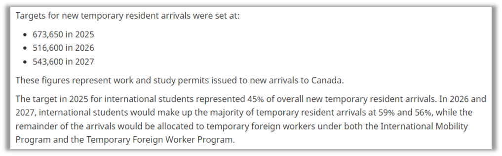 其中,2025年,国际学生占新增临时居民入境人数的比例为45%。到2026年和2027年,这一比例将分别上升至59%和56%,成为临时居民的主要来源。其余的临时居民配额将分配给外籍工人,涵盖国际流动计划(IMP)和临时外国工人计划(TFWP)。