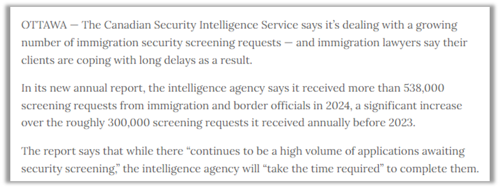 近日,加拿大安全情报局(CSIS)在其最新发布的年度报告中披露,该机构正在处理的移民安全筛查请求数量激增,2024年全年共收到超过53.8万份安全筛查申请,较往年年均约30万份,增幅显著。