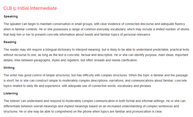 按照移民局要求,申请者必须有等同于雅思5分左右的英语或法语水平。加美移民认为这是非常合理的设定。创业移民,顾名思义就是来加拿大进行创业,所以基础的英语或法语沟通能力是必须的,否则移民局也不会相信你的生意可以成功运作起来。那雅思英语5分具体的是代表你的英语能力达到了中级英语的入门水平,听说读写都可以基本运用也没有大的障碍,看看下面关于CLB 5的官方描述