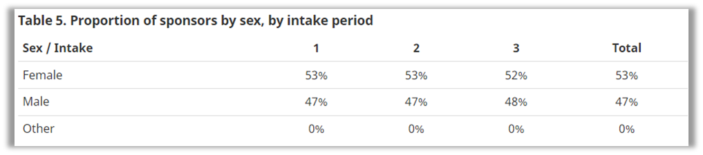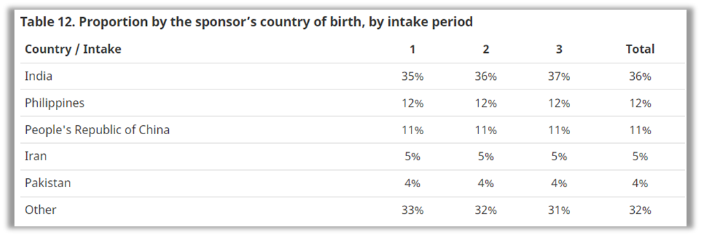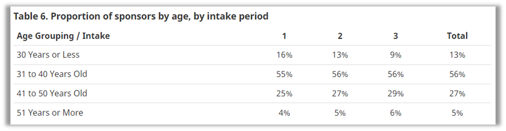 这一趋势在不同申请周期中保持相对稳定,说明家庭团聚担保人群体主要由经济类移民组成,反映出他们在定居多年后具备了为亲属提供经济支持和稳定环境的能力。