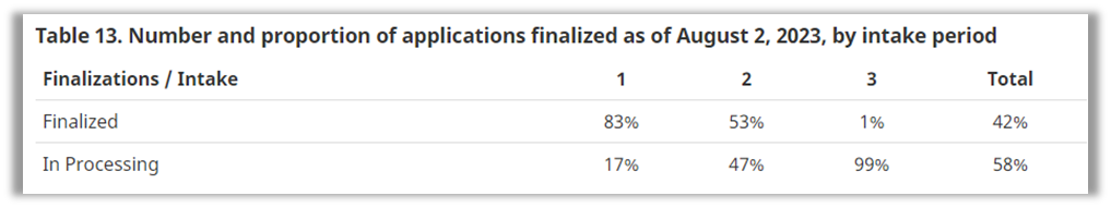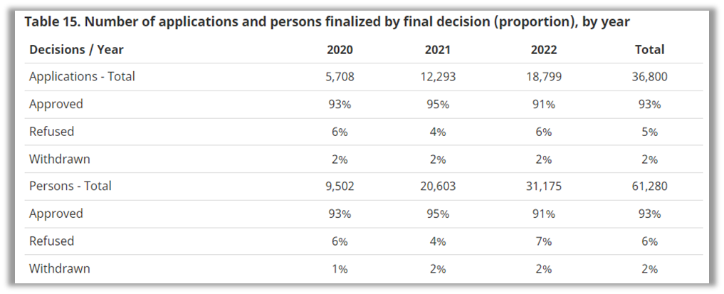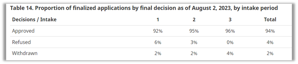 截至2023年8月2日,加拿大家庭团聚移民在各申请周期中已完成审理的申请显示出极高的批准率,进一步印证该类别在政策上的包容性与稳定性。具体审理结果如下: