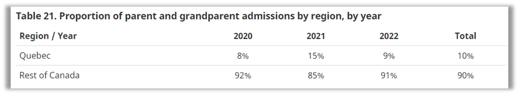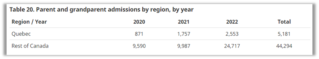 魁北克省2020年至2022年共接收5,181名父母和祖父母,其中: