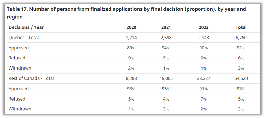 根据最新统计数据,2020年至2022年间,加拿大家庭团聚移民在魁北克省与全国其他地区的审理结果总体相似,但全国其他地区的批准率略高于魁北克省。