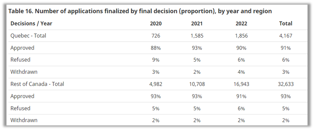 魁北克省整体批准率为91%,拒签率为6%,撤回率为3%;