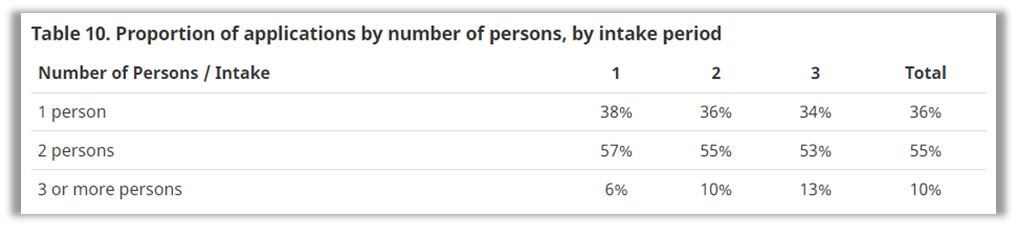 根据最新统计,加拿大家庭团聚移民中的主申请人须为担保人的父母或祖父母,并且必须在申请中列出其配偶、同居伴侣及受抚养子女,无论是否一同前往加拿大。数据显示,大多数申请涵盖两位申请人,其次为单人申请,而涉及三人及以上的家庭成员虽属少数,但比例逐年上升。具体来看: