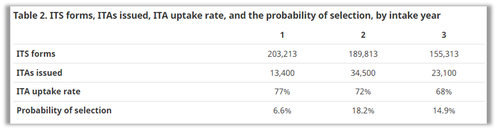 第二轮(2021年):由于继续使用2020年积压的ITS表格,这一轮的ITS总数为189,813份,共发出34,500份ITA,ITA响应率下降至72%,担保人被选中的概率提高至18.2%。