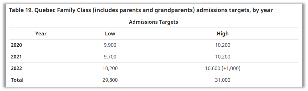 根据魁北克移民计划,魁北克省家庭类别(含父母及祖父母)入境目标如下:
