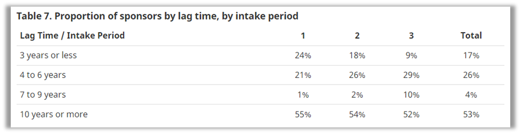 “等待时间”是指新移民获得永久居民身份至提交家庭团聚担保申请之间的时间。这表明许多担保人在移民加拿大多年后,选择为家人申请团聚。数据显示,大多数担保人是在获得永久居民身份十年以上后才递交担保申请,比例达到53%。