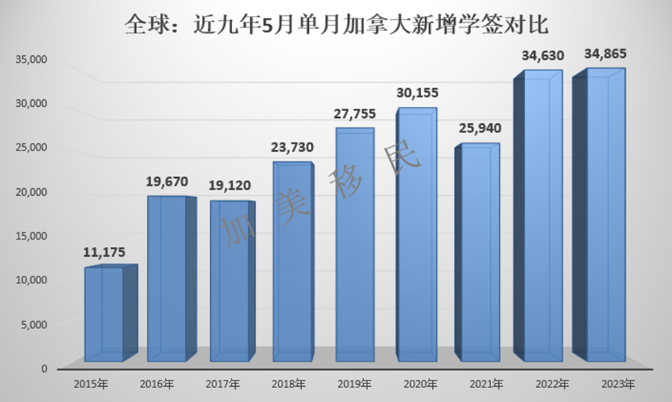 IRCC统计数据显示2023年5月全球加拿大学签新增总数为34865份,和2022年5月份同期数据相比略有增加,并且创下近九年里同期数据最高记录。