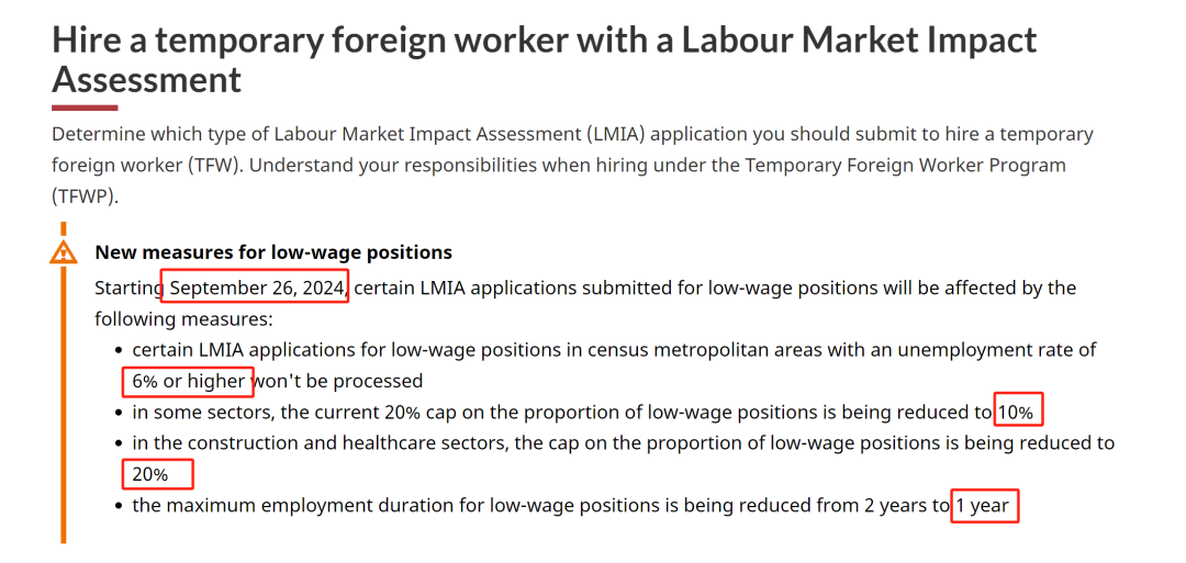 从2024年9月26日开始,低工资职位的LMIA(劳动力市场影响评估)申请将有重大调整,重点如下:
