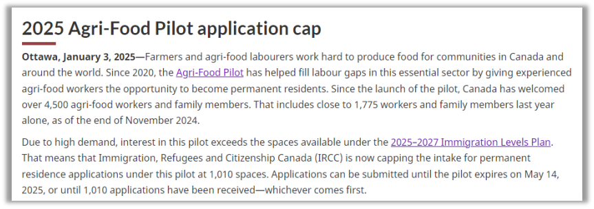 昨天2025 年1月3日,加拿大移民部(IRCC)同时公布两个重大消息,一是将在今年关停农业食品试点(Agri-food pilot)移民项目, 二是今年不会开放父母团聚移民申请。这两大移民项目都是联邦类移民项目中的热门,又同时叫停,势必会影响到正在准备中的项目申请人