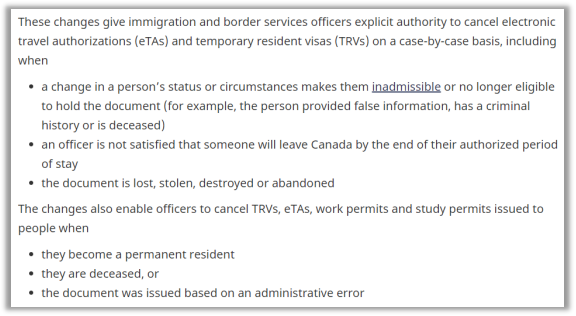 官员现在拥有明确的权力,在发现持有人身份或状况发生变化、导致其不再符合资格时,可立即取消eTA或TRV。例如,申请人提供了虚假信息、存在犯罪记录,或者已经去世,这些情况下,其临时居民身份将被撤销。