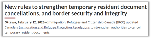 2025年2月12日,加拿大移民、难民和公民事务部(IRCC)宣布对《加拿大移民和难民保护条例》进行了更新,强化了边境移民官取消临时居民文件的权力。这些新规定明确了边境移民官在特定情况下可取消电子旅行授权(eTA)和临时居民签证(TRV),以提高加拿大移民体系的安全性和完整性。
