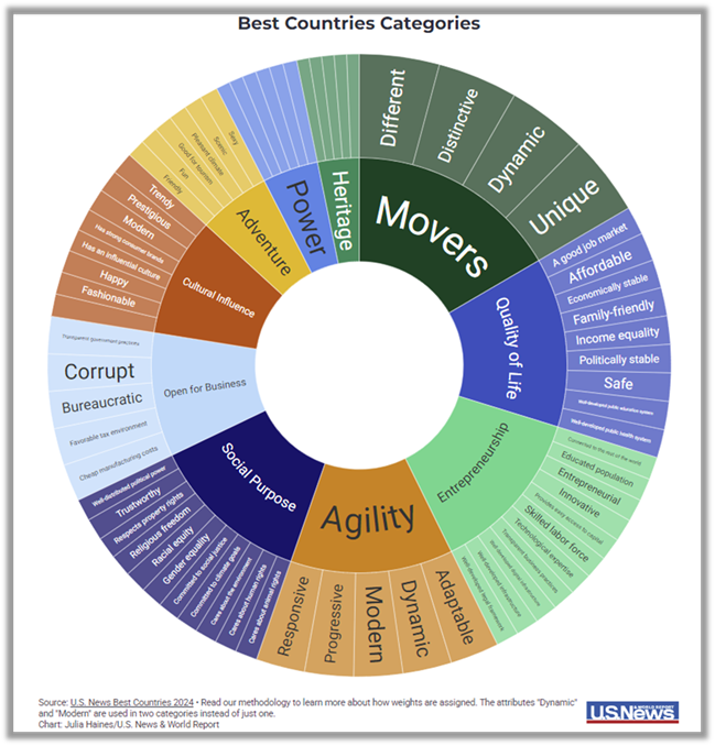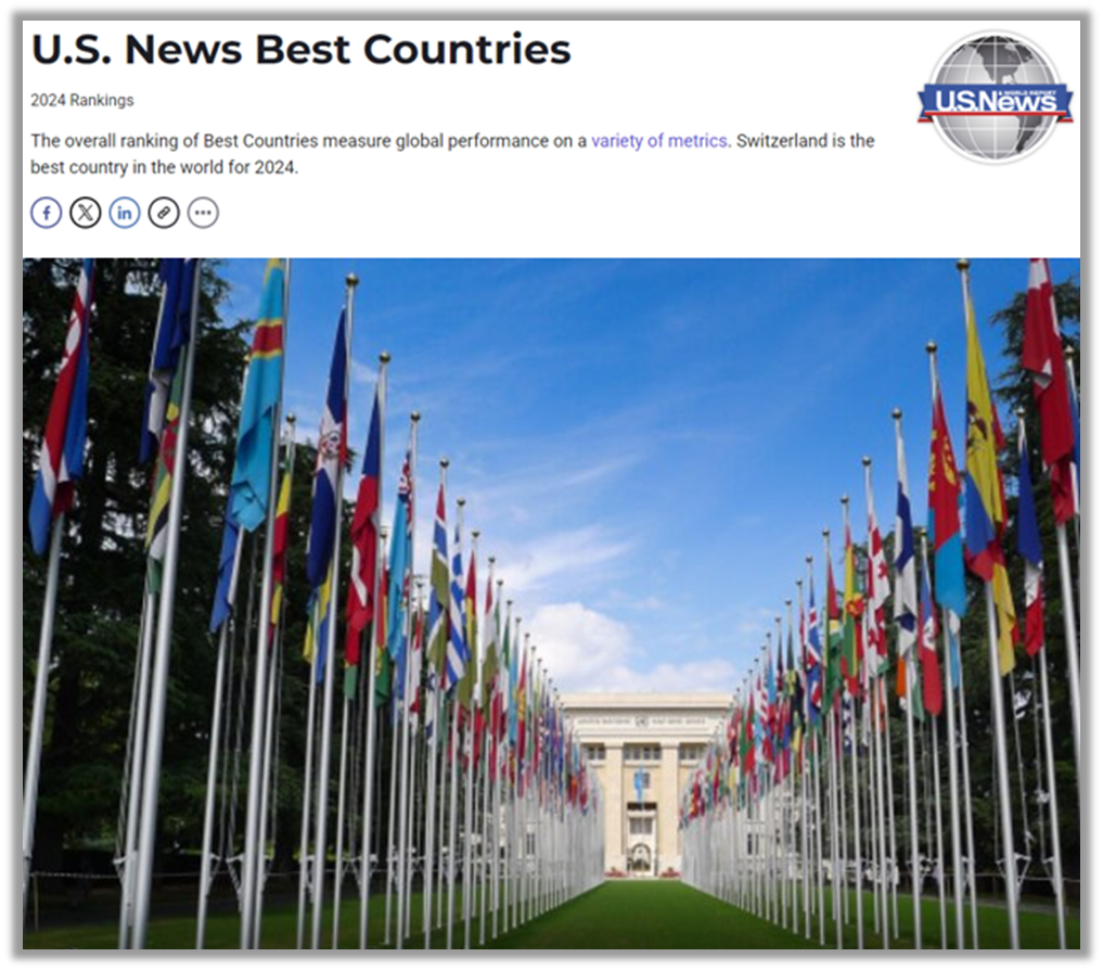 《美国新闻与世界报道》(U.S. News & World Report)于近期发布了2024年全球最佳国家综合排名、全球生活质量最佳国家排名、全球最具影响力国家排名。