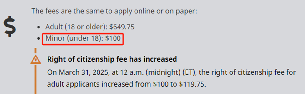 请注意:未成年人(18岁以下)在申请公民时仅需支付100加元的处理费,该费用未作调整。