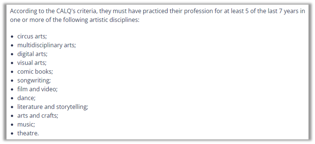 提交意见请求:向魁北克艺术与文学委员会(CALQ)或其它领域相关机构提交意见请求,证明其在专业领域的杰出才能。