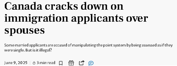 据了解,该类操作正引发广泛关注。一些已婚申请人选择不将配偶列入共同申请人,以“单身”身份获得更高综合排名系统(CRS)分数,从而提高被邀请移民的机会。