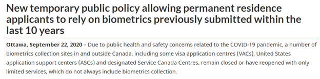 9月22日IRCC公告:暂时允许移民申请人使用近十年内递交过的移民类指纹信息