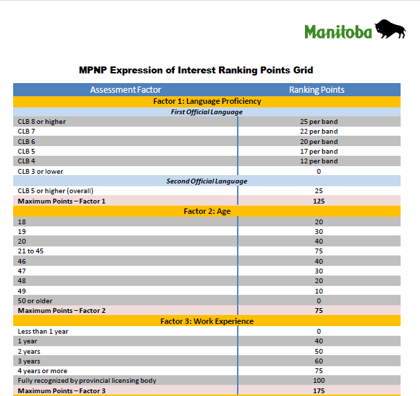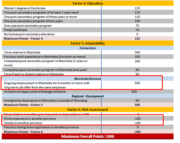 而从曼省下面的打分表可以看到,在曼省工作6个月以上,并有全职长期的Job Offer就有500分的加分。当然,曼省外的学习和工作经历分别都会被扣分。